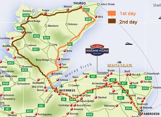 We left from aberdeen at 9.30, we followed the way for Inverness and from there the west coast for Thurso where we found a very receiving private, small hostel called "Sandra's Snack bar & Backpackers hostel" that has also a webpage at the address http://www.sandras-backpackers.ukf.net. Here we spent our night and the day after we woke up at 6 o'clock to see the sunrise in the higher point of the scotland (i can't remember the name!).